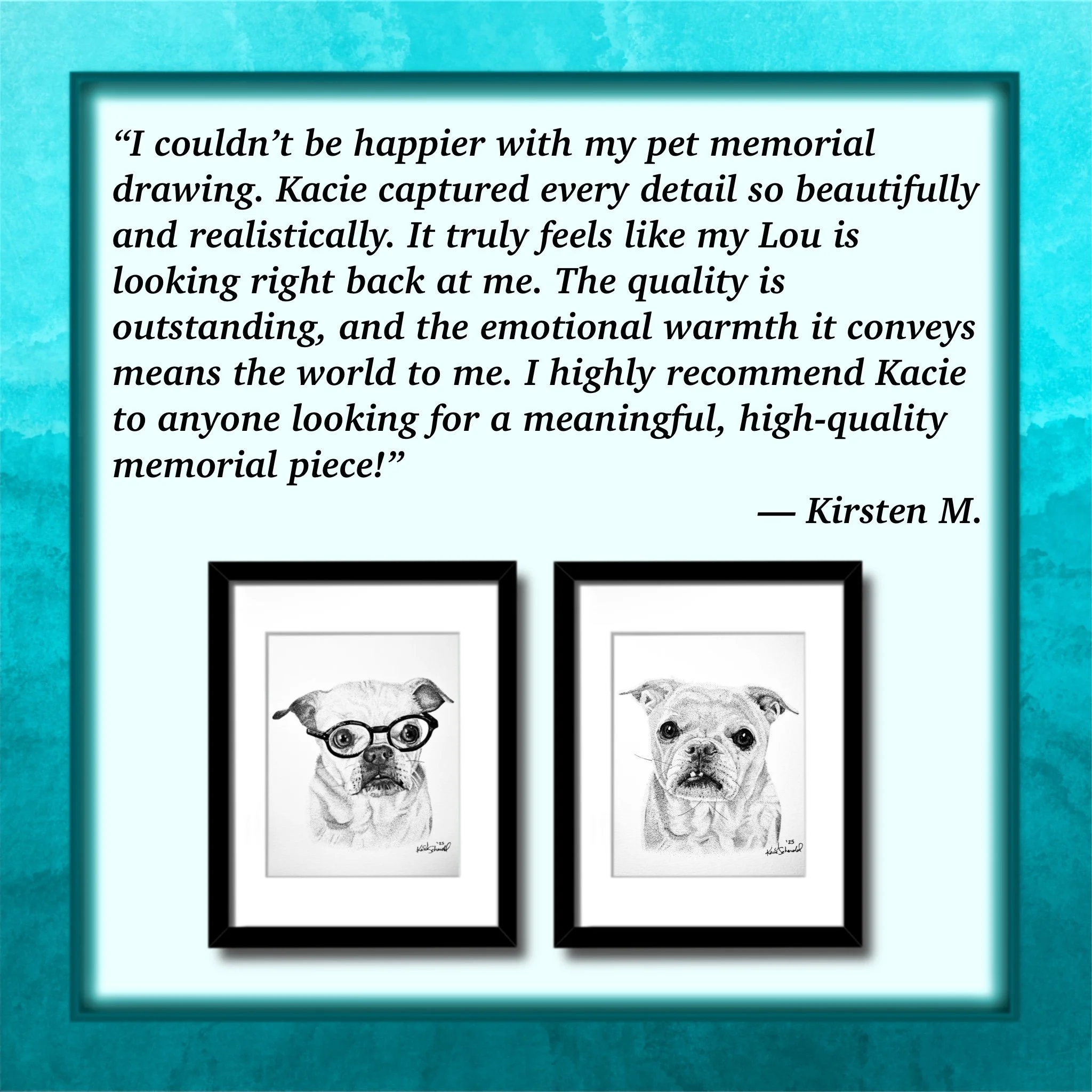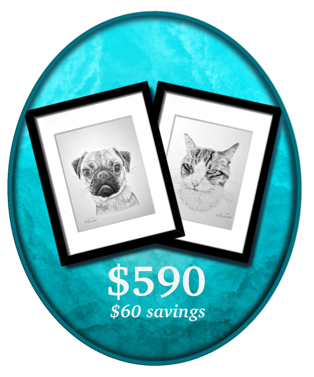 It can take up to 20 hours to draw this type of portrait. A photo of your pet is referenced in order to capture as much detail as possible. Your pet’s portrait will be created with love and care to make sure they closely resemble their photo.